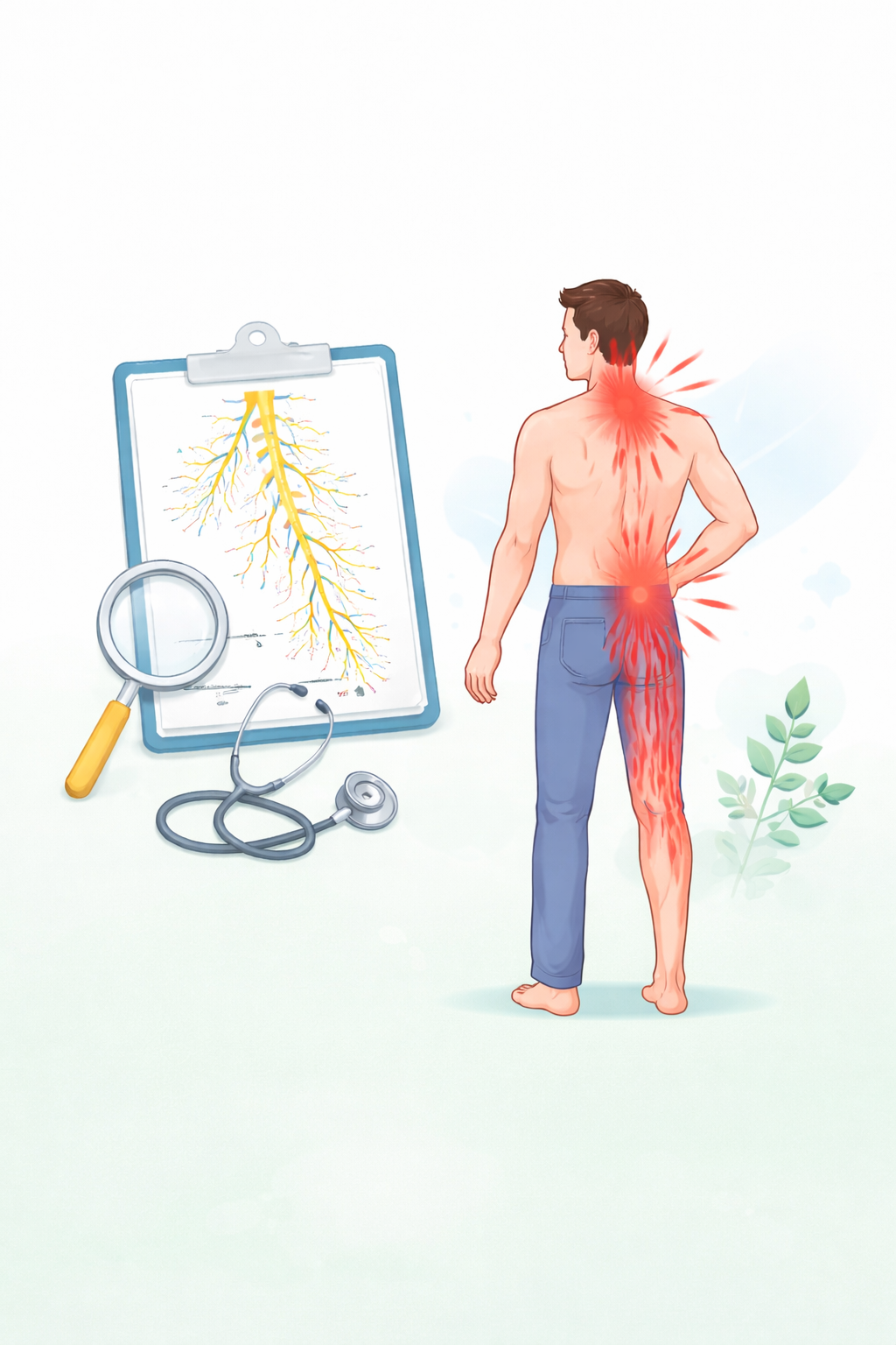 신경은 뇌에서부터 척수를 지나 팔다리 끝까지 연결되어 있기 때문에, 신경의 시작점에서 문제가 생기면 그 신경이 지배하는 모든 부위에 통증이 퍼질 수 있습니다.