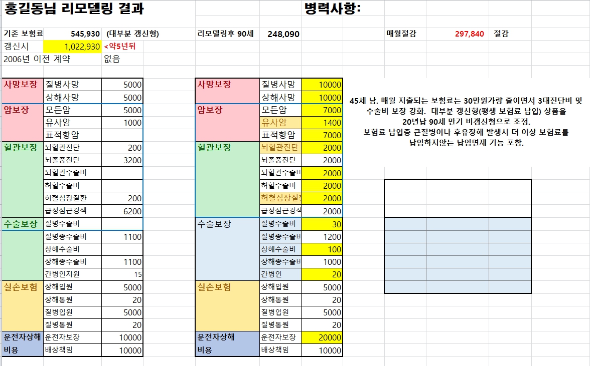 - 결과: 월 보험료 24만 원으로 절감, 보장 범위 확대