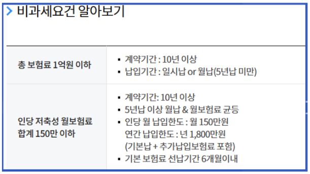 - 보장성 보험(예: 암보험, 실손의료보험)은 비과세 혜택의 대상이 아닙니다.