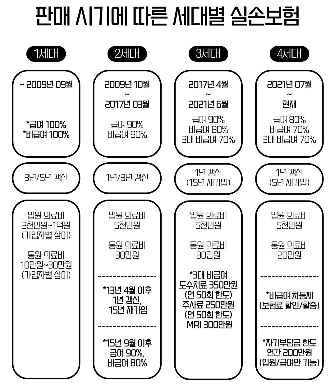 1세대 (표준화 전) | ~2009.09 | 약관이 보험사마다 상이 | 급여+비급여 | 없음 또는 매우 낮음 | 광범위하게 보장 | 3~5년 단위 |