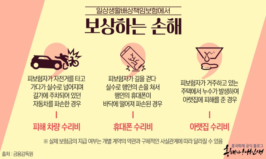 일상배상책임보험이란, 피보험자(보험에 가입한 자)가 일상생활 중 발생한 우연한 사고로 인해 타인의 신체나 재산에 손해를 입혀 법률상 배상책임이 발생했을 때, 그 손해를 보험회사가 대신 보상해주는 보험을 말합니다.
