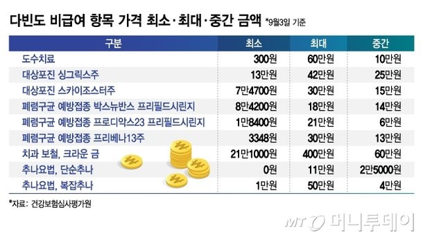 | 주제별 항목 | 병원급: 1인실료·도수치료, 의원급: 예방접종, 치과·한의과 분야별 특성 |